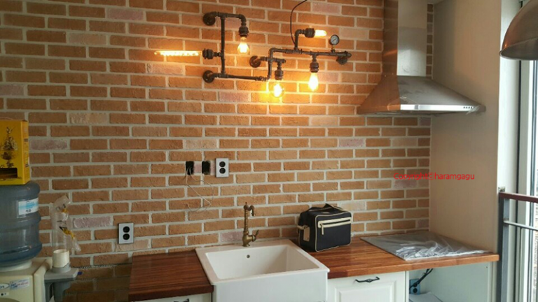 벽면 전체를 감싸는 파벽돌과 트랜디한 파이프형 따뜻한 조명이 제일먼저 눈에 들어오는 주방에서