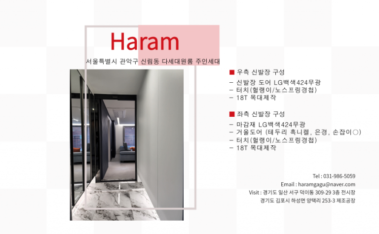 portfolio 카테고리 전체주방가구신발장붙박이장서재용가구각종수납장사무용가구원룸 원룸 서울특별시 관악구 신림동 다세대원룸, 주인세대 페이지 정보 작성자 최고관리자 댓글 0건 조회 2,044회 작성일 22-11-23 14:31 본문 이전글서울특별시 관악구 신림동 다세대원룸, 주인세대 22.11.23 다음글경기도 파주 운정가람마을 1단지 신발장 22.08.26 목록