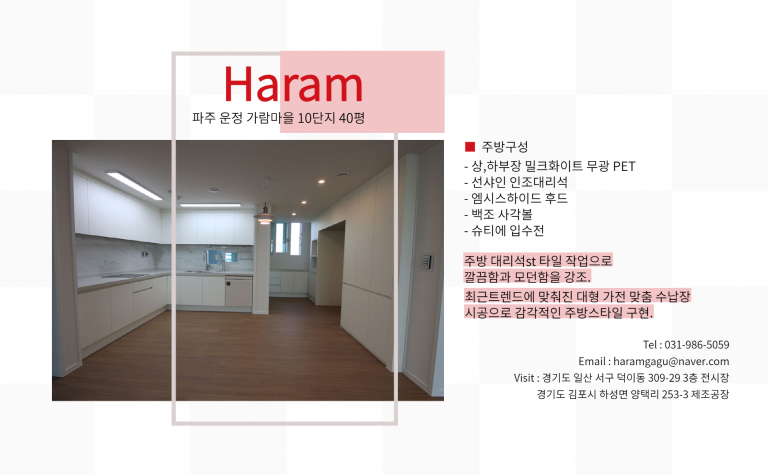 portfolio 카테고리 전체주방가구신발장붙박이장서재용가구각종수납장사무용가구원룸 주방가구 파주 운정 가람마을 10단지 40평 주방가구 페이지 정보 작성자 최고관리자 댓글 0건 조회 4,463회 작성일 21-11-08 08:16 본문 이전글중랑구 중화한신A 33평 주방가구 21.11.10 다음글은평구 수색동 대림한숲 42평 주방가구 21.11.05 목록