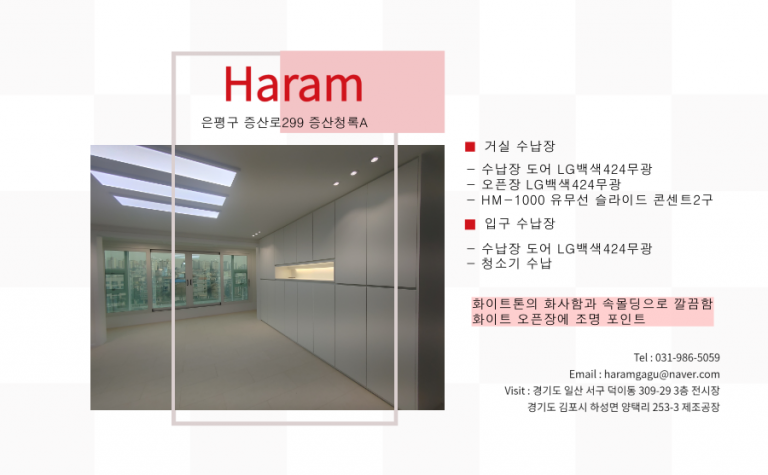 portfolio 카테고리 전체주방가구신발장붙박이장서재용가구열린 분류 각종수납장사무용가구원룸 각종수납장 서울시 은평구 증산로299 증산청록A 수납장 페이지 정보 작성자 최고관리자 댓글 0건 조회 2,104회 작성일 22-03-29 10:42 본문 이전글서울시 구로구 구로동 이앤씨벤쳐드림타워 수납장 22.04.22 다음글성남시 SR태권도장 수납장 21.11.17 목록